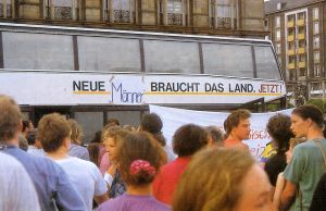 Von der Kreuzkirche führt der Demonstrationszug quer über den Altmarkt zu einem Infozelt und einem Infobus des Bundesverkehrsministeriums, die für den Autobahnbau werben. |