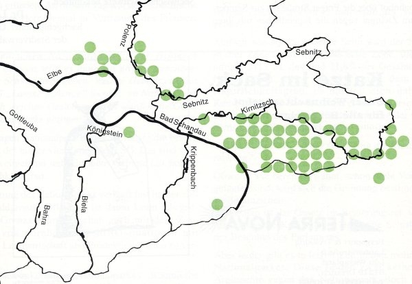 Wie wir auf der Verbreitungskarte sehen, liegen seine Vorkommen, von wenigen Ausnahmen abgesehen, überwiegend im rechtselbischen Bereich. Die wenigen, mir derzeit bekannten linkselbischen Standorte sind: Bahnhof Schmilka, Schöna (Marktweg) und Heideberg (Gohrisch).