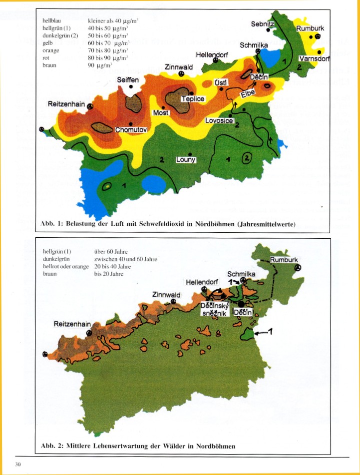Die untere Abbildung auf S. 30 zeigt die durchschnittliche Lebenserwartung des Waldes in Nordböhmen. (Die Lebenserwartung ist eine Periode vorn Beginn des Schädigungsprozesses bis zum Tode des Baumes). Die am meisten geschädigten Teile mit der kürzesten Lebenserwartung sind dunkelrot. In der Böhmischen Schweiz befindet sich das einzige Gebiet mit einer sehr kurzen Lebenserwartung (maximal 20 Jahre) um den Decinsky Sneinik (Hoher Schneeberg).