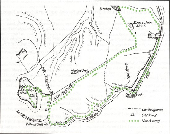 Nachdem wir vom Kornmarktstein etwa 800 m weitergewandert sind, mündet von rechts das Tal des Quergelobtbaches ein. Auch dieses Bächlein verschwindet in trockenen Sommern oft. Dieses Tal laufen wir kurz nach oben, bis wir auf den Gelobtweg stoßen. Etwa 20 m rechts befindet sich die Ziskaquelle. Wir biegen aber nach links auf den Gelobtweg ein und folgen diesem weiter in südwestlicher Richtung. Nach knapp 500 m befindet sich direkt rechts am Weg ein etwa 1 m hoher bewachsener Stein mit der Aufschrift "Hinter Korn Marcht 1812" . Weitere sieben bis acht Minuten Fußmarsch führen uns zu einer Wegkreuzung am Hertelsgrundbach, auch dieser ist meist nur ein Rinnsal. Wir laufen geradeaus weiter, nun auf dem Kriegsweg, der ständig ein wenig oberhalb des Gelobtbaches verläuft. Nach knapp 10 min stoßen wir auf einen breiten Querweg, die Alte Tetschener Straße. Wenn man hier kurz nach links geht, stößt man zur Landesgrenze, diese Stelle wird "Böhmisches Tor" genannt, da an dieser Stelle der Wildzaun, der noch Ende des 19 Jhs. entlang der Grenze verlief, ein Tor hatte. Der Wildzaun grenzte die Jagdreviere der böhmischen Fürsten Thun und Clary-Aldringen gegen Sachsen ab.