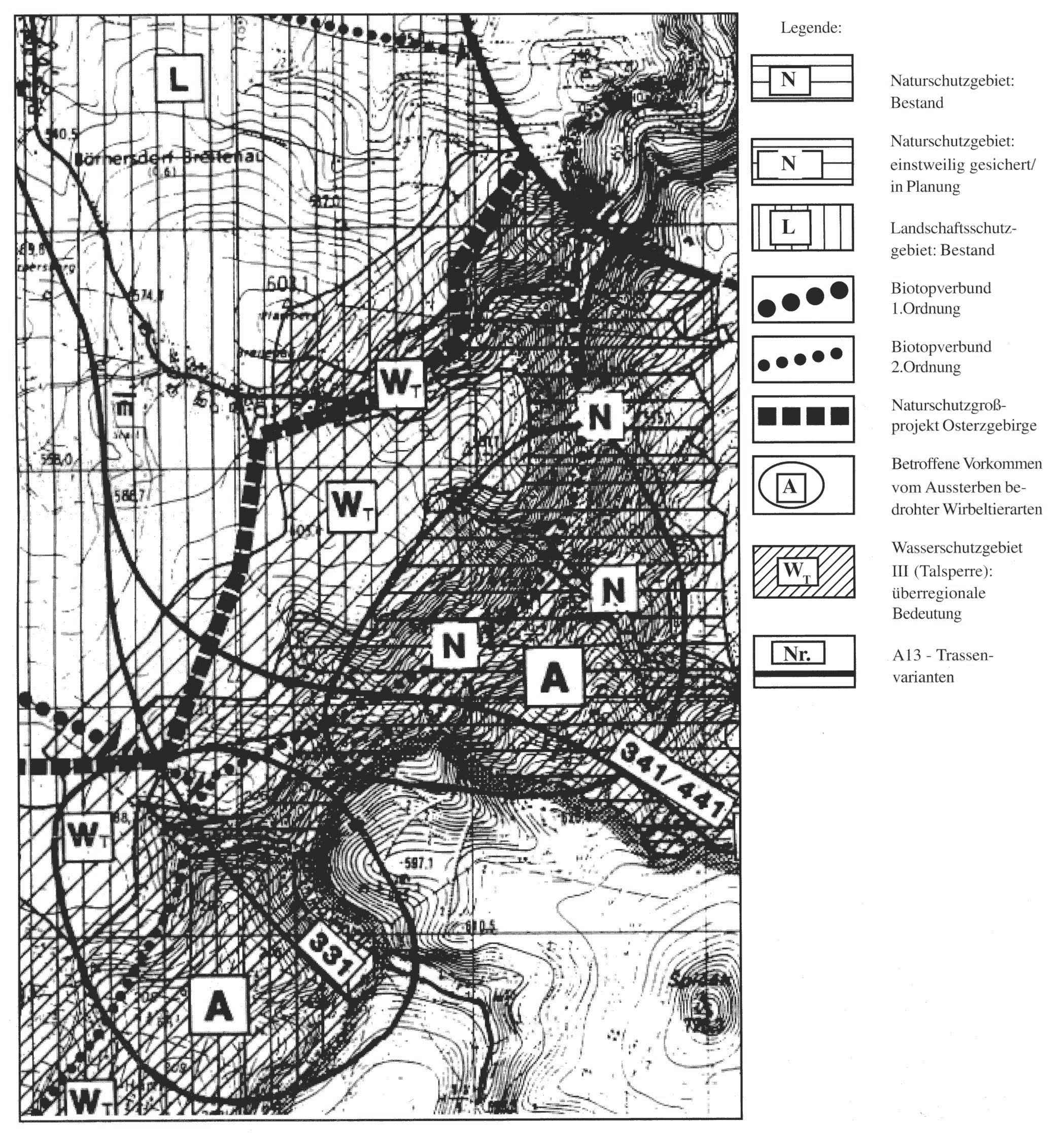 Die größten Schwierigkeiten erwarten die Planer jedoch im Bereich des Grenzüberganges nach Tschechien. Daß bei der Wahl der Trasse in diesem sensiblen Bereich zwischen Pest und Cholera entschieden wurde, zeigen Passagen der Umweltverträglichkeitsstudie zum Grenzübergangsbereich im Linienbestimmungsverfahren. Dort heißt es,...daß die [gewählte] Linie 331 bei insgesamt sehr hohem Konfliktpotential einer mit hoher Wahrscheinlichkeit noch eingriffsintensiveren Linie 341/441 vorzuziehen ist." Dieses sehr hohe Konfliktpotential drückt sich u.a. in der Berührung des geplanten Naturschutzgebietes "Oelsen", in der Durchquerung eines Trinkwasserschutzgebietes mit überregionaler Bedeutung, in der Durchquerung eines Gebietes mit Vorkommen vom Aussterben bedrohter Wirbeltiere und in einer artenspezifisch sehr starken Barrierewirkung aus. Wenn man hier das Vorgehen der Planer bei der Verkürzung der Zschonergrundbrücke bedenkt, kann man sich vorstellen, wie "sensibel" auch im Grenzbereich vorgegangen wird.