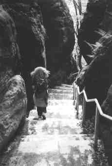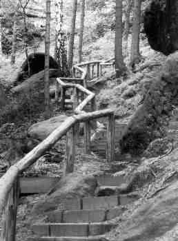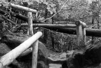 Und noch etwas anderes macht vielen Besuchern zunehmend Sorgen: Die "richtig zugelassenen", markierten Wege werden oft in einem Maße ausgebaut, daß es den naturgewöhnten Besucher graut. 20cm dicke Geländer säumen oft rechts und links die Wege und dienen nur der Absperrung, nicht aber der Sicherheit, denn an diesen Baumstämmen kann sich keiner mehr festhalten. Massive Treppen, z.B. aus Eisenbahnschwellen, verhindern Fels- und Bodenberührung. Es geht dabei nicht nur um die Paradebeispiele "Breite Kluft" in den Schrammsteinen oder auch den Basteiaufstieg von Osten (vgl. Abb., insbesondere das Geländer am Basteiweg!). Auf dem Schrammsteingrat gibt es dicke Geländer in Wadenhöhe (wozu?). Brandstufen (unterer Teil) und Füllhölzelweg aus dem Polenztal hoch zum Ziegenrücken sind regelrecht stöckelschuhfest, ebenso Treppen aus dem Kirnitzschtal hoch zum Pohlshorn wie auch Teile des Flößersteigs. Es soll sich jeder selbst davon überzeugen, daß diese Baumaßnahmen zunehmend flächendeckend werden. Auch in der Presse kam dieses Thema schon mehrfach zur Sprache. Leser fragten wohl zu Recht, wieso wir noch in die Alpen fahren dürfen, wenn die Gesetze hier angeblich einen solch perfekten Wegeausbau erfordern. Sicher ist nur eines: Solche Magistralen entfremden den Besucher der Natur, ganz langsam und unmerklich. Und sie nehmen das bißchen Abenteuer, das wir beim Begehen solcher Wege haben.