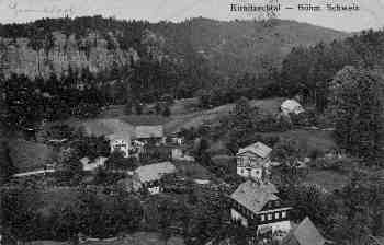 Nachdem man lange nur durch Fichtenforste gelaufen ist, überrascht der Anblick dieser lieblichen, teils mit Kastanienbäumen bestandenen Lichtung . Gegenüber, am anderen Ufer der Kirnitzsch, erheben sich die "Rabensteine" von Hinterhermsdorf wie eine Mauer.