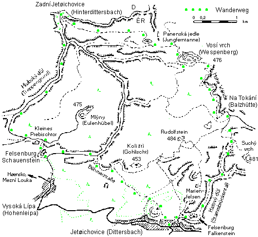 | Wanderroute: | Jetřichovice (Dittersbach) - Stammbrückental - Na Tokání (Balzhütte) - Vosí vrch (Wespenberg) - Panenská jedle (Jungferntanne) - Zadní Jetrichovice (Hinterdittersbach) - Malá Pravèická brána (Kleines Prebischtor) - Burg Saunstejn (Schauenstein) - Èeská silnice (Böhmerstraße) - Jetřichovice |