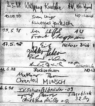 Diese Gipfelbuchseiten der Tiefblickspitze im Brandgebiet wurden von Mitarbeitern der Nationalparkverwaltung kopiert. Trotz der Rundum-Beschilderung der Falkenbrutzone herrschte reger Kletterbetrieb. Der Wanderfalkenhorst befand sich nur einen Meter neben dem 4. Ring des Kletterweges “Silberblick”. In der ganzen Gegend war nur dieser eine Gipfel gesperrt. (Originalkopien von Ulrich Augst)
