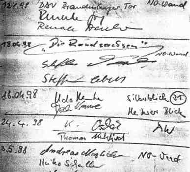 Diese Gipfelbuchseiten der Tiefblickspitze im Brandgebiet wurden von Mitarbeitern der Nationalparkverwaltung kopiert. Trotz der Rundum-Beschilderung der Falkenbrutzone herrschte reger Kletterbetrieb. Der Wanderfalkenhorst befand sich nur einen Meter neben dem 4. Ring des Kletterweges “Silberblick”. In der ganzen Gegend war nur dieser eine Gipfel gesperrt. (Originalkopien von Ulrich Augst)